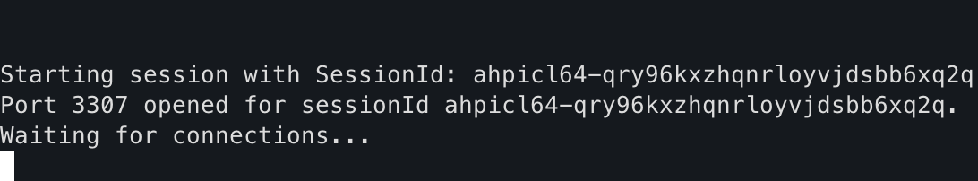 aws ssm start-session \ --target i-012345abcdefgh \ --document-name AWS-StartPortForwardingSessionToRemoteHost \ --parameters '{"host":["YOUR_RDS_ENDPOINT_ADDRESS"],"portNumber":["3306"],"localPortNumber":["3307"]}'i-012345abcdefgh: 1단계에서 복사한 '징검다리' EC2 인스턴스의 ID로 교체YOUR_RDS_ENDPOINT_ADDRESS: 2단계에서 복사한 실제 RDS 엔드포인트 주소로 교체