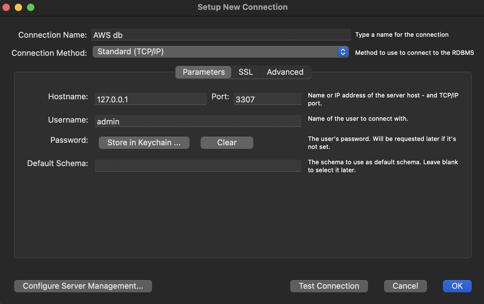localhost:3306으로 접속을 시도 - 이 접속 요청은 터미널에서 실행 중인 SSM 세션 관리자에게 가로채임
