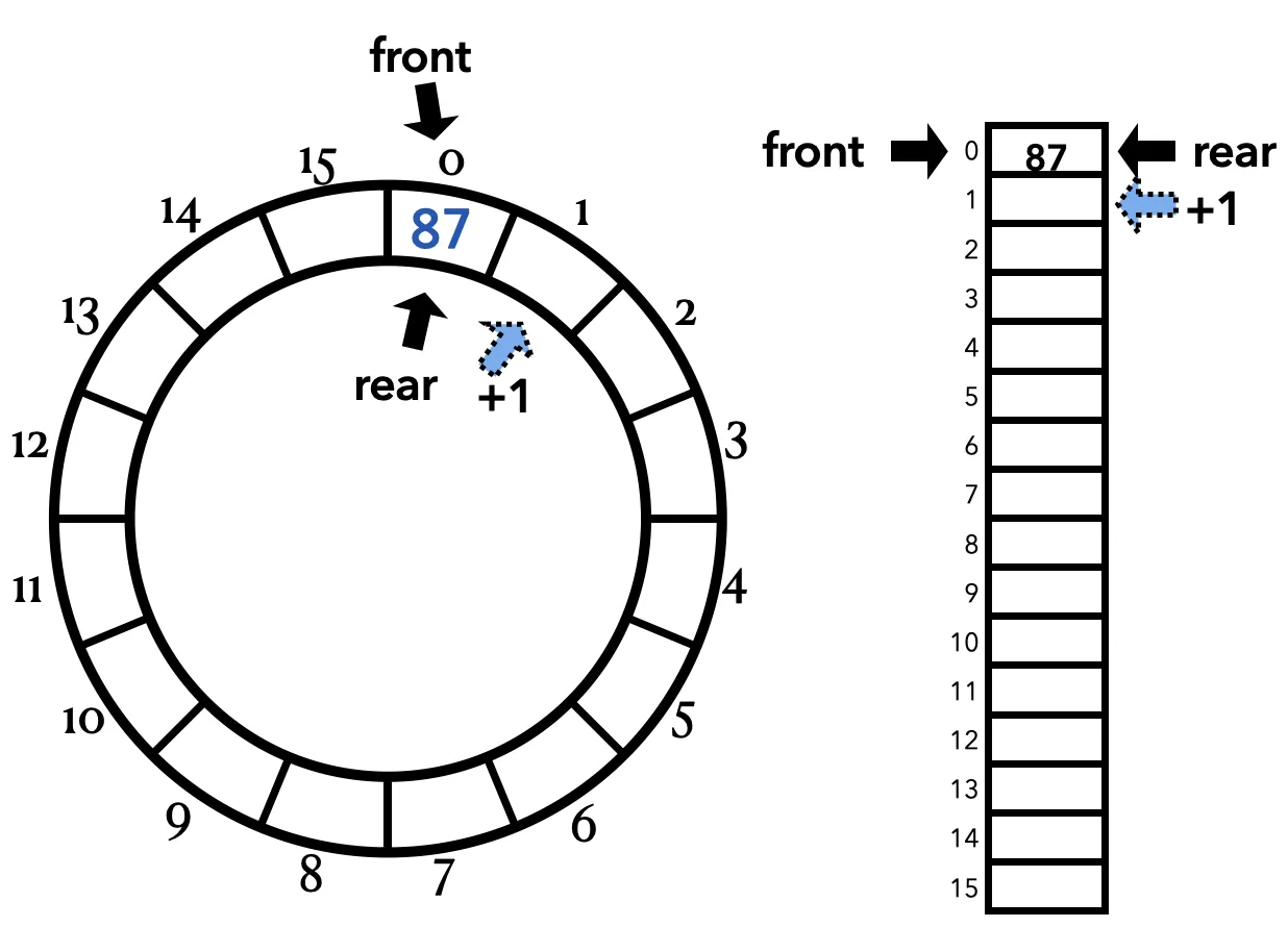 - rear 포인터 업데이트: (rear + 1)을 capacity로 나눈 나머지로 계산하여 원형 구조를 유지