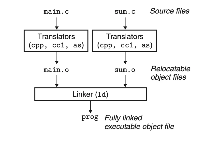 ld main.o sum.o → main (ELF 실행 파일)