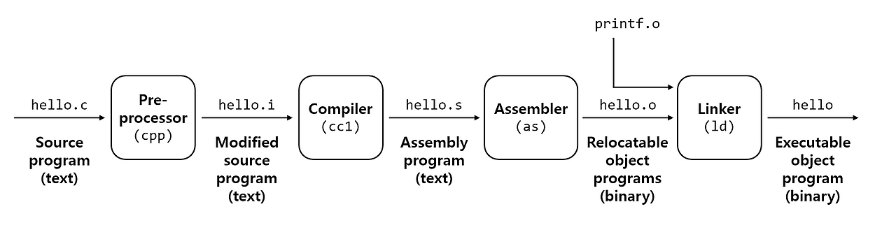 linux> gcc -o hello hello.c - GCC 컴파일러 드라이버는 소스파일 hello.c를 실행파일인 hello로 번역