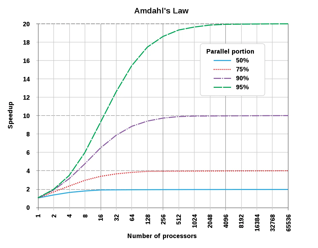 범례(Parallel portion) : 병렬화 가능한 작업의 비율 (50, 75, 90, 95)