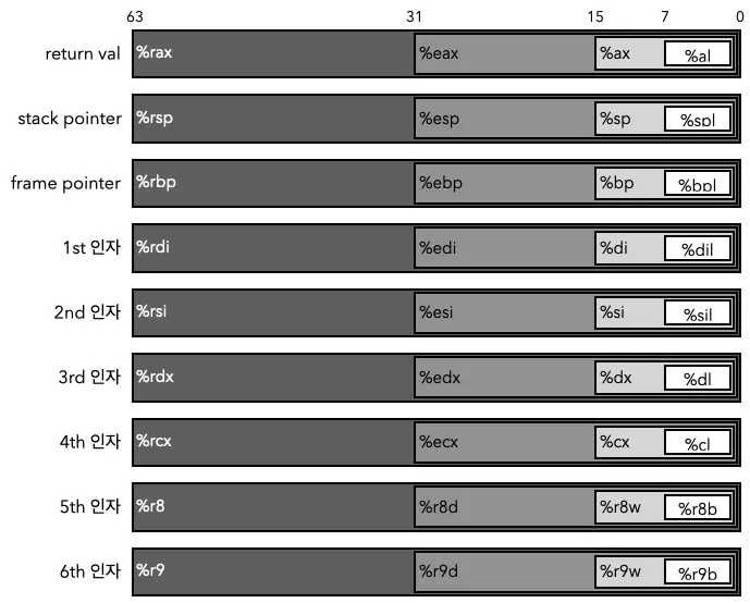 - 하위 8비트 : %sil, %dil, %bpl, %spl, %r8b ~ %r15b
