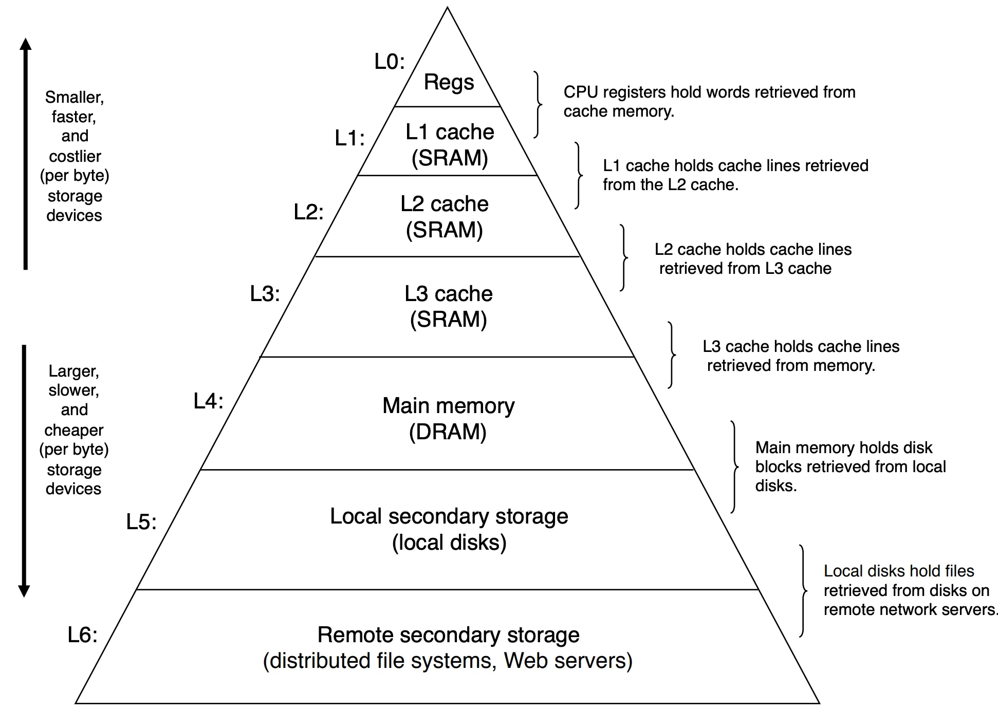 주요 골자는, L1은 L2의, L2는 L3의 캐시역할을.. 이런식으로 한 계층의 저장장치는 다음 하위레벨 저장장치의 캐시 역할을 한다. 더 나아가 네트워크 시스템에서 로컬 디스크는 다른 시스템의 디스크(서버 등)에 저장된 데이터의 캐시 역할이다.
